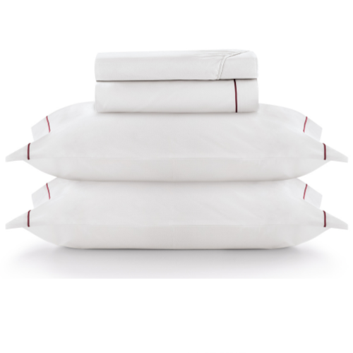 Conteúdo da embalagem: 1 Lençol com Elástico, 1 Sobre Lençol e 2 Fronhas com Abas + Friso Bordô.